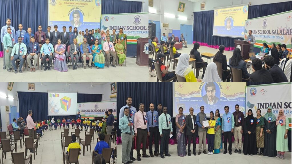 Indian school Salalah has celebrated National Math Day on Tuesday,16th December’25 which was conducted by the Department of Mathematics. ‘’Mathematics-Art and Creativity” was the theme of the Math Day. The programme started at 11 am at the auditorium. Mr. Deepak Patankar, Principal, Mr. Mammikutty, VP, Dr. Vipin Das, AVP, Mrs. Anita Rose, AVP, Mr. Narayanankutty, HOD, Maths department and Mrs. Meena Venkat, Subject Incharge were present at the occasion.